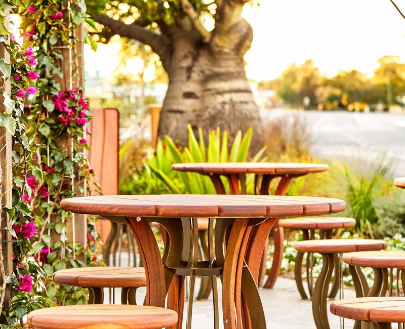 A key aspect of the project was to make subtle references to the Bottle Tree, an integral part of the area’s identity. The steel frames of each product were designed to reflect the bulbous shape of the plant and finished with an earthy bronze powder coat. This complemented the Spotted Gum timber tops Platinum Timber & Ply provided, ensuring a cohesive and aesthetically pleasing final product.